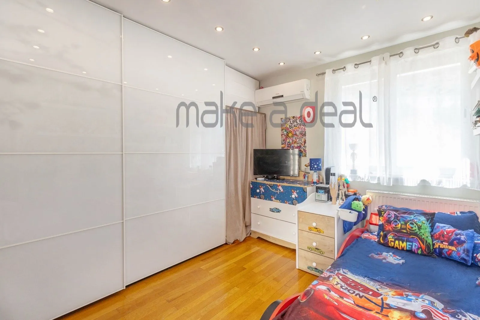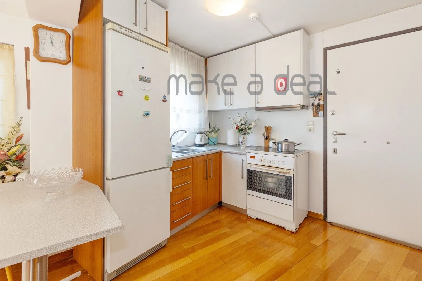 Additional features include autonomous natural gas heating, solar water heating, double-glazed aluminum frames with screens, security door, alarm system, and air conditioning. The property also offers a basement storage room (8 sq.m.), a parking space (15 sq.m.), and an exclusive-use attic with unobstructed panoramic views.
